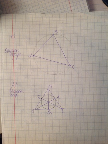 Нарисуйте правильный вписанный и описанный треугольник (paint), и объясните чем они отличаются? Нужно построить описанный треугольник в окружность, но не знаю как...