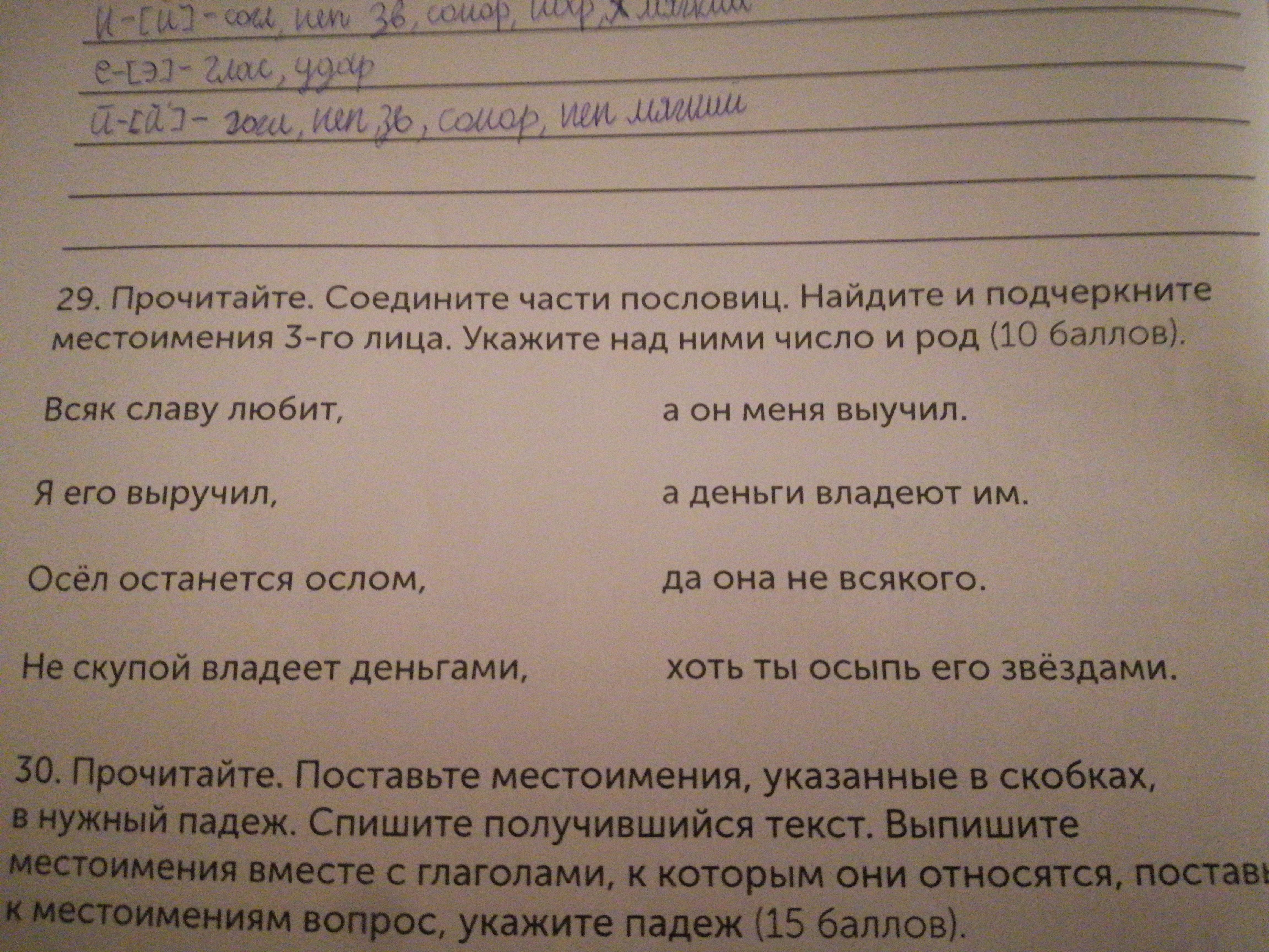 Прочитайте. Соедините части пословиц. Найдите и подчеркните местоимения 3-го лица. Укажите над ними число и род.