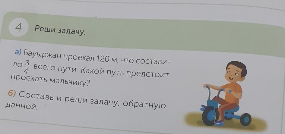4 Реши задачу. а) Бауыржан проехал 120 м, что состави- ЛО 3 всего пути. Какой путь предстоит 4 проехать мальчику? б) Составь и реши задачу, обратную данной.С условием