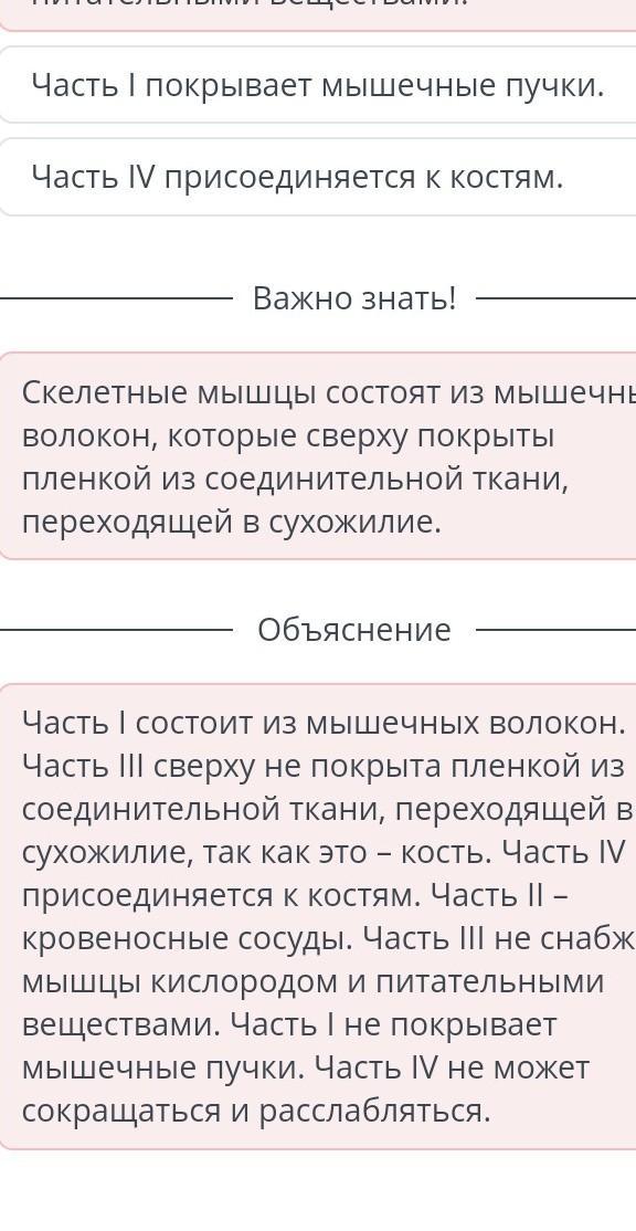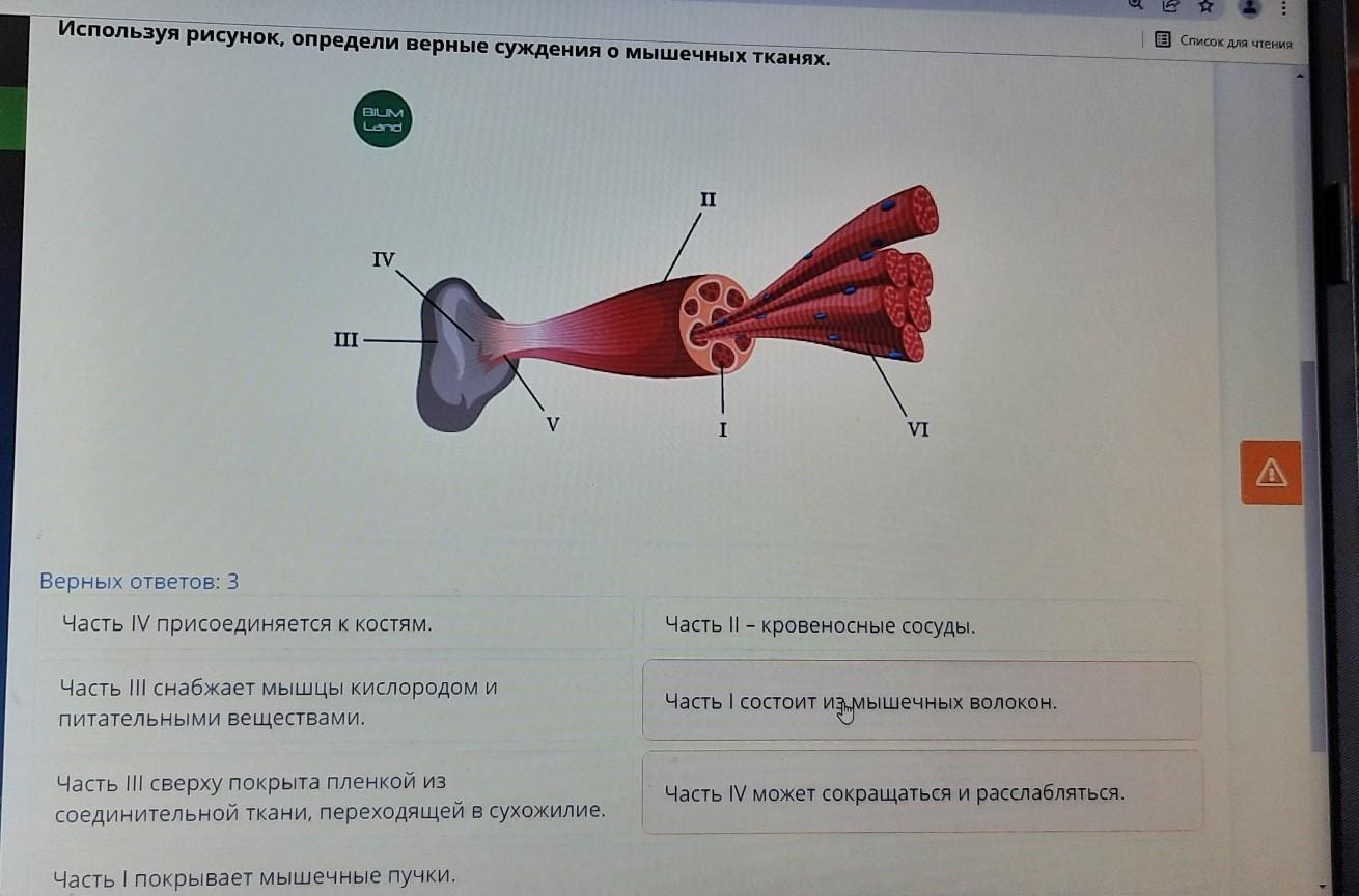 Строение мышц Используя рисунок, определи верные суждения о мышечных тканях. Верных ответов: 3 Часть IV присоединяется к костям. Часть || — кровеносные сосуды. Часть III снабжает мышцы кислородом и питательными веществами. Часть | состоит из мышечных волокон. Часть II сверху покрыта пленкой из майном переулланайраммамилии Часть IV может сокращаться и расслабляться. соод