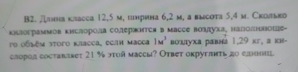 В2. Длина класса 12,5 м, ширина 6,2 м, а высота 5,4 м. Сколько килограммов кислорода содержится в массе вожуха, наполняюще- го объем этого класса, если масса воздуха равна 1,29 кг, а кислород составляет 21 % той массы? Ответ округлите до едениц.