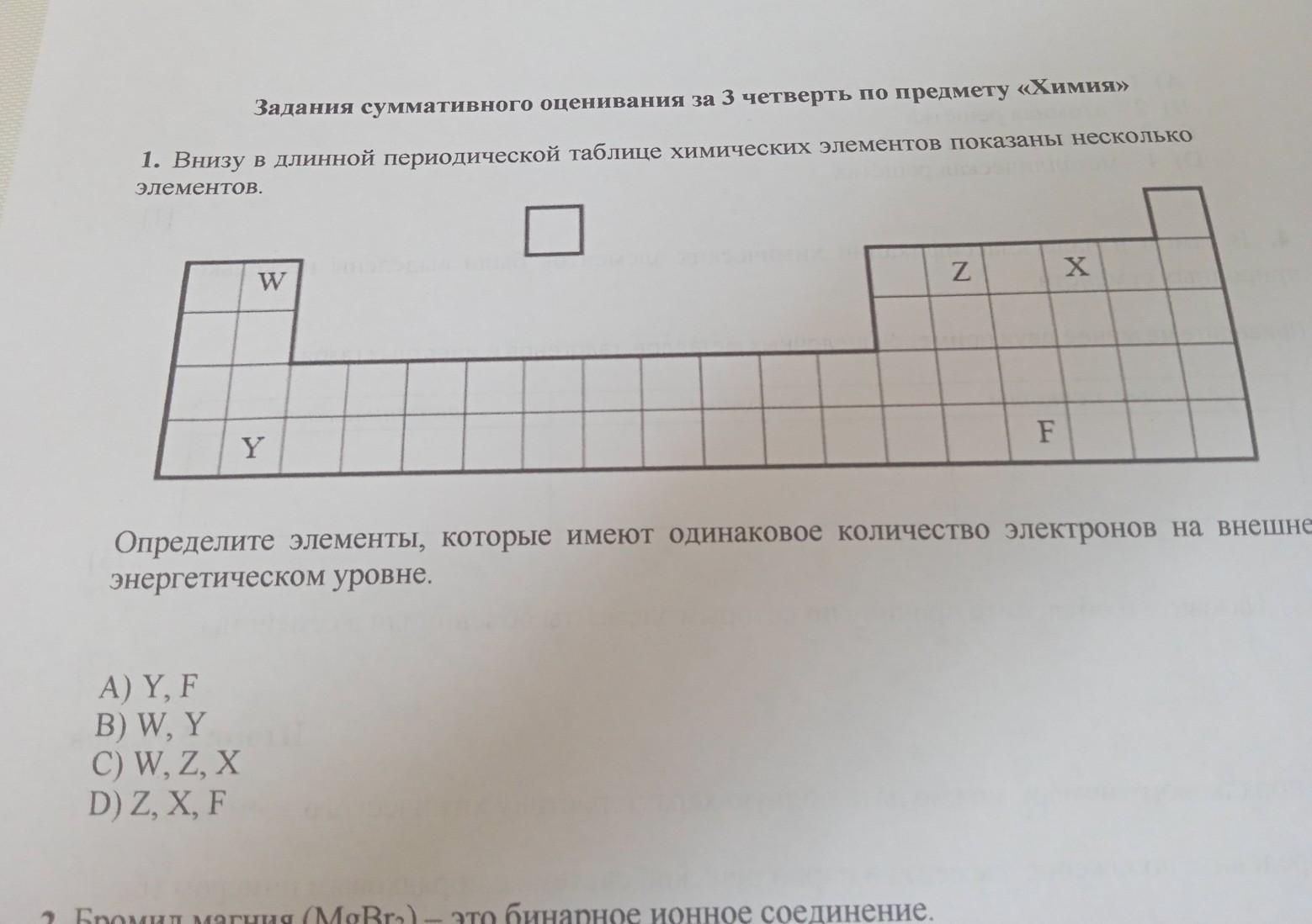 Внизу в длинной периодической таблице химических элементов показаны несколько элементов. определите элементы, которые имеют одинаковое количество электронов на внешнем энергетическом уровне. a) y, f b) w, y c) w, z, x d) z, x, f