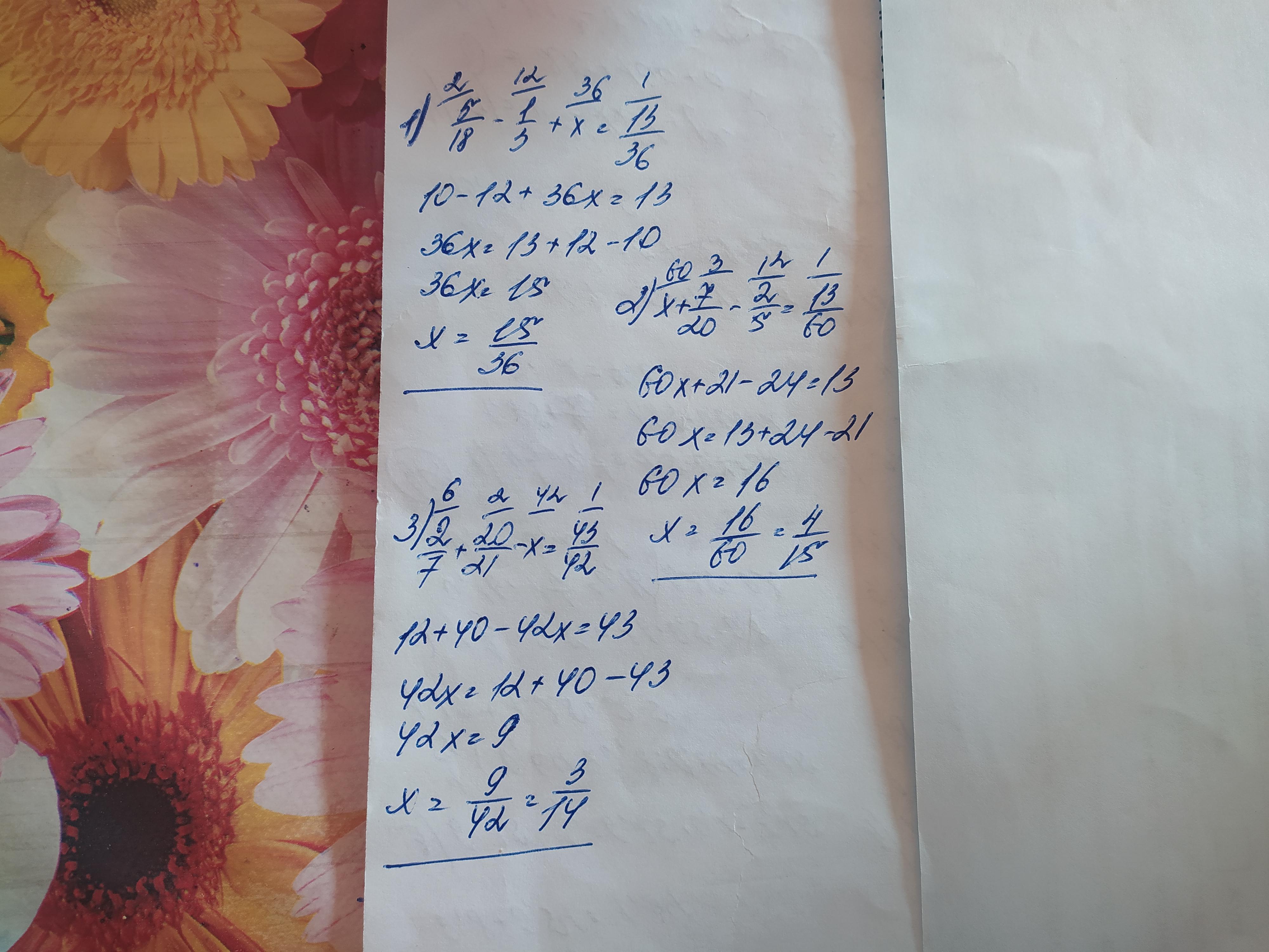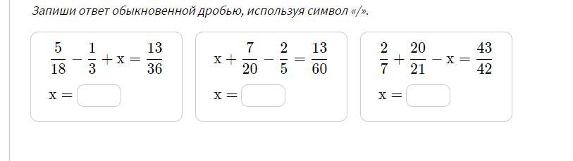 18 5 − 3 1 +x= 36 13 x=x= x+\dfrac{7}{20}-\dfrac{2}{5}=\dfrac{13}{60}x+ 20 7 − 5 2 = 60 13 x=x= \dfrac{2}{7}+\dfrac{20}{21}-x=\dfrac{43}{42} 7 2 + 21 20 −x= 42 43 x=x=