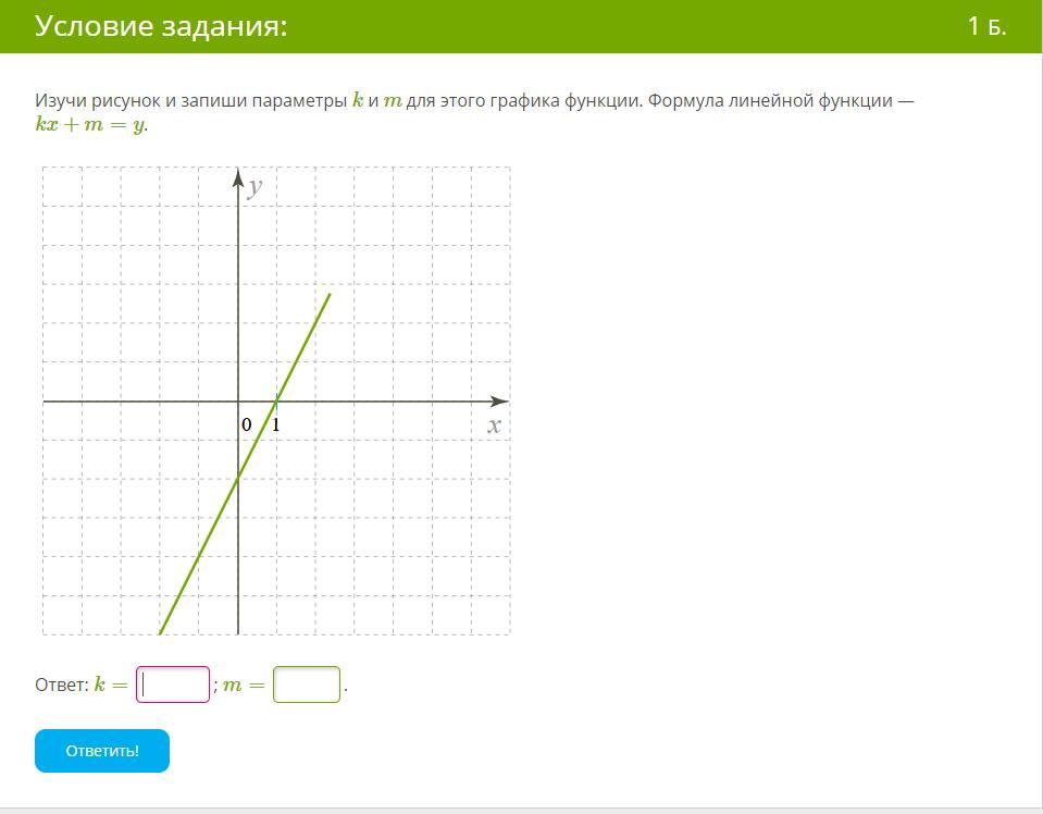 чтобы найти к и m, используем точки, принадлежащие графику этой функции (1;0) и (0;-2), подставим координаты в данную формулу, получим искомые коэффициенты.