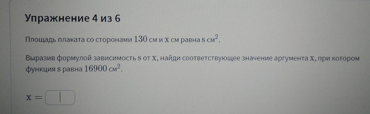 Выразив формулой зависимость s от x, найди соответствующее значение аргумента x, при котором функция s равна 16900 см² (учи ру)