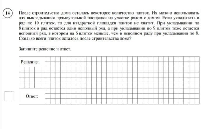 2. При укладке по 9 в ряд, в неполном ряду остаётся на 6 плиток меньше. То есть единственный случай, когда такое может быть - в неполном ряду первой укладки 7 плиток. При второй укладке остаётся ряд с одной плиткой.