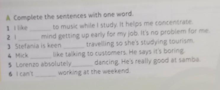 A Complete the sentences with one word. 1 I like to music while I study. It helps me concentrate, 2 mind getting up early for my job. It's no problem for me, 3 Stefania is keen travelling so she's studying tourism, 4 Vick like talking to customers. He says it's boring 5 Lorenzo absolutely dancing. He's really good at samba, 5 can't working at the weekend,