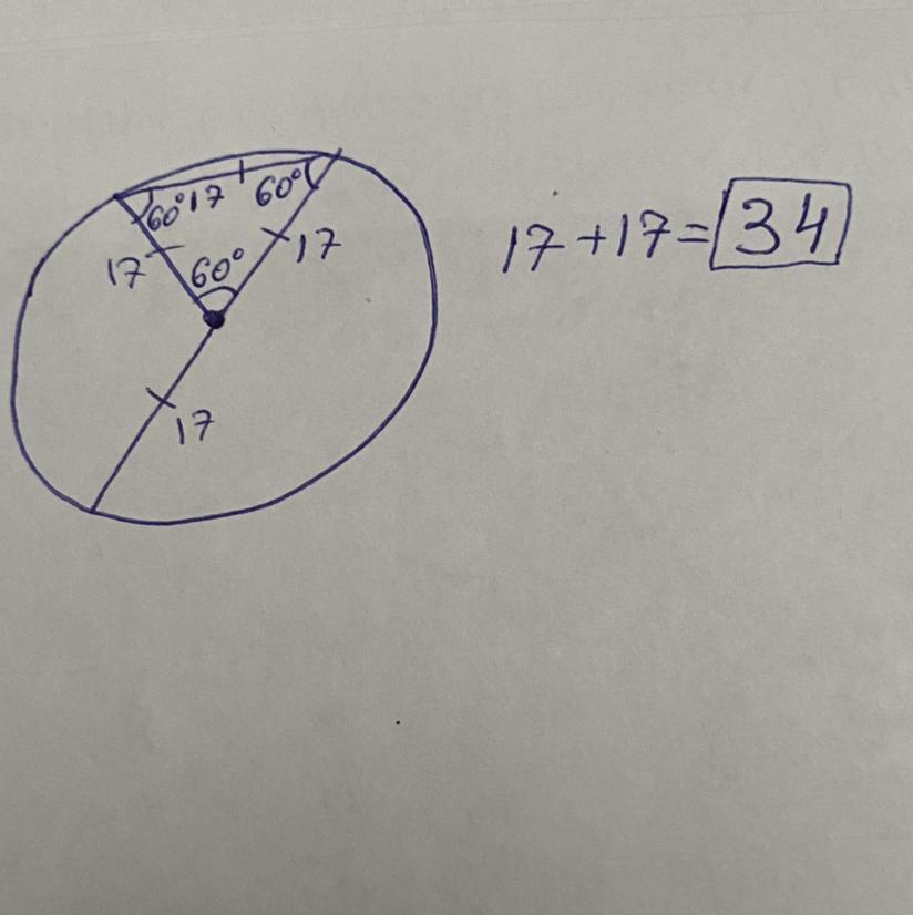 Треугольник ONM правильный(равносторонний), поэтому все стороны равны. ON и OK равны как радиусы, отсюда 17+17=34