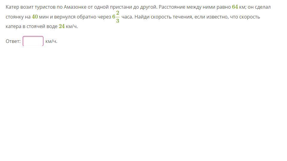 Время катера в пути туда и обратно: 6 2/3 - 2/3 = 6 (часов);