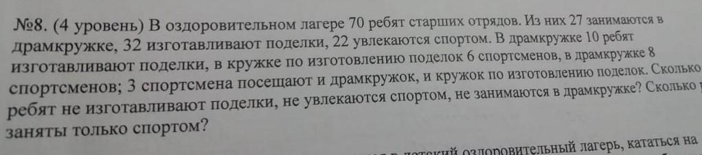 В драмкружке 6 детей (27-10-8-3=6), делают поделки – 13 (32-10-6-3=13) и 5 занимаются спортом → в одну секцию записано 24 человека (6+13+5=24);