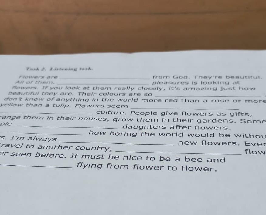 Flowers are a true gift from God. They’re beautiful. All of them. One of life’s pleasures is looking at flowers. If you look at them really closely, it’s amazing just how beautiful they are. Their colours are so rich and deep. I don’t know of anything in the world more red than a rose or more yellow than a tulip. Flowers seem to be a big part of every culture. People give flowers as gifts, arrange them in their houses, grow them in their gardens. Some people even name their daughters after flowers. I can’t imagine how boring the world would be without flowers. I’m always coming across new flowers. Every time I travel to another country, I find lots of flowers I’ve never seen before. It must be nice to be a bee and spend all day flying from flower to flower.