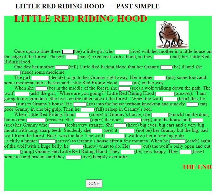 was, lived, had, called, told, was, needed, decided, put, went, was, saw, asked, answered, heard, ran, went, ate, fell, came, knocked, answered, opened, stepped, saw, looked, had, saw, wasn't, swallowed, arrived, caught, knew, cut, jumped, were, had, lived.