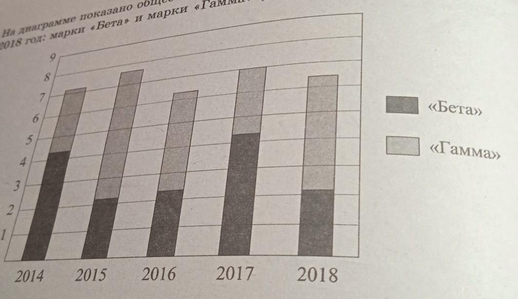 11. На диаграме показано общее количество продаас автомобилей двух марои 2014, 2018 год: марки «Бета» и марки «Гамма» (в тысячах штук). 8 7 6 с «Бета, 5 «Гамма 4 3 2 1 0 2014 2015 2016 2017 2018 В какие годы автомобилей марки «Бета» продали больше, чем автомобилей мари «Гамма»?
