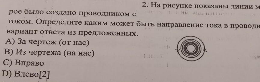 На рисунке показаны линии магнитного поля, которое было создано проводником с током. Определите каким может быть направление тока в проводнике. Выберите один вариант ответа из предложенных.