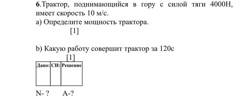 6.Трактор, поднимающийся в гору с силой тяги 4000Н, имеет скорость 10 м/с.