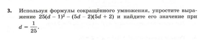 используя формулы сокращённого умножения упростите выражение 25(d-1)^2-(5d-2)(5d+2) и найдите значение при d = 1/25
