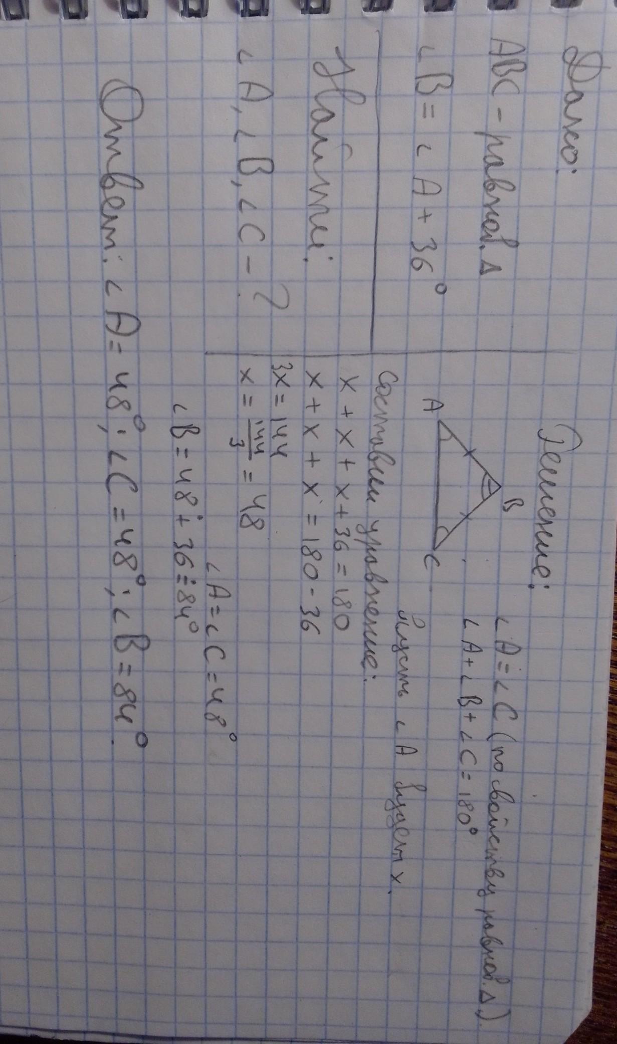 Найдите углы равнобедренного треугольника если угол при основании на 36 градусов меньше угла при вершине