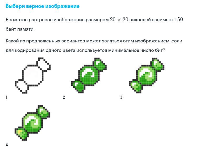 несжатое растровое изображение размером 20х20 пикселей занимает 150 байт памяти. какой из предложенных вариантов может являться этим изображением если для кодирования одного цвета используется минимальное число бит Срочно пжпжжп