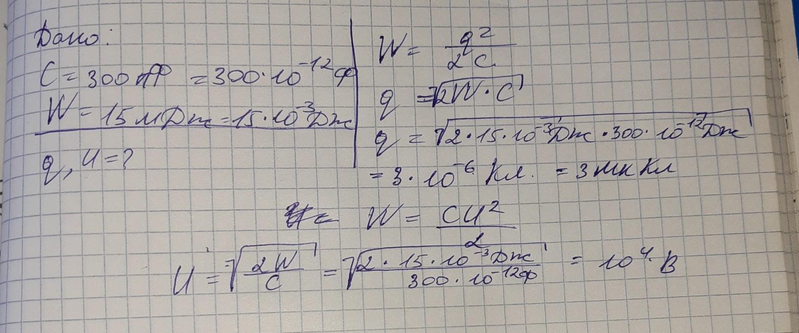 Энергия электрического поля заряженного конденсатора электроёмкостью 300пФ равна 15мДж Определите заряд конденсатора и напряжения между его обкладками