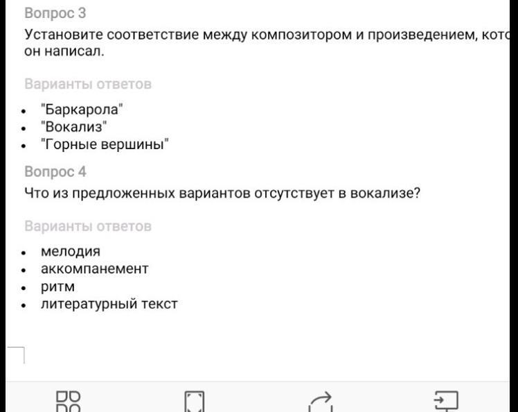 В 3 вопросе не указаны композиторы, чтобы сделать соответствие. Поэтому композитором "Баркаролы" может быть и Ф. Шуберт, и П.И. Чайковский; "Вокализ" С. Рахманинов и "Вокализ" Ф. Абт; "Горные вершины" А. Варламов и "Горные вершины" А. Рубинштейн.