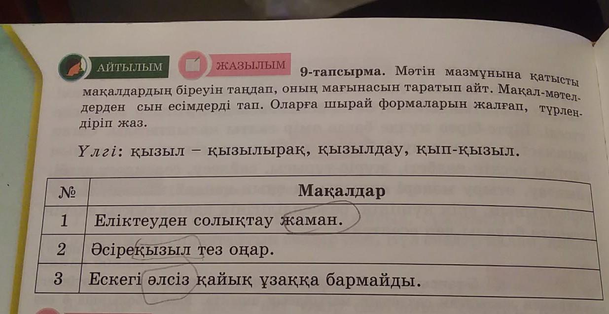 9-тапсырма. Мәтін мазмұнына қатысты АЙТЫЛЫМ ЖАЗЫЛЫМ макалдардың біреуін таңдап, оның мағынасын таратып айт. Макал-мене дерден сын есімдерді тап. Оларға шыраи формаларын жалғап, турлен діріп жаз. Үлгі: қызыл қызылырақ, қызылдау, қып-кызыл. No Мақалдар Еліктеуден солықтау жаман. Әсіреқызыл тез оңар. Ескегі өлсіз кайық ұзаққа бармайды.