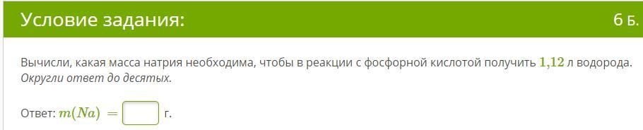 Вычисли, какая масса натрия необходима, чтобы в реакции с фосфорной кислотой получить 1,12 л водорода Ответ округли до десятых