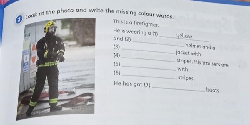 2 Look at the photo and write the missing colour words. This is a firefighter, He is wearing a (1) and 2) (3) yellow helmet anda jacket with stripes. His trousers are (5) (6) stripes. He has got (7) boots.