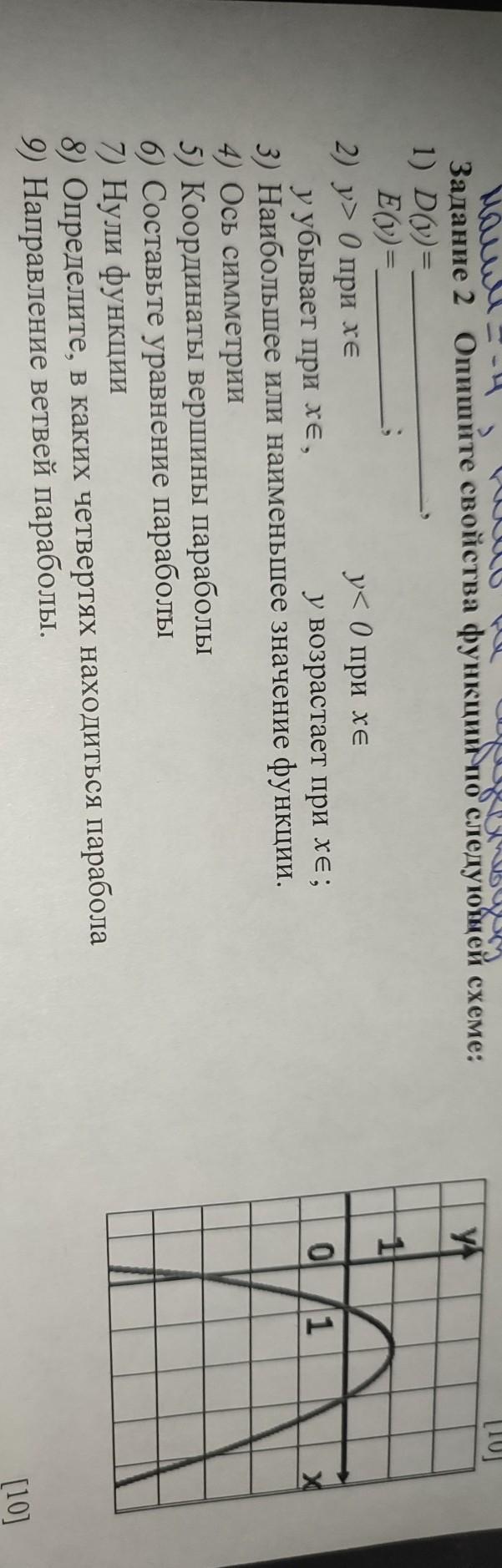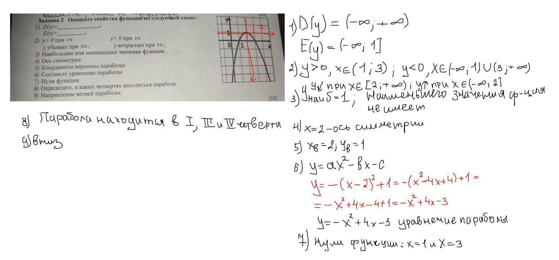 парабола смещена вправо на 2 клетки значит -(х-2)², парабола смещена вверх на 1 клетку, значит -(х-2)²+1 -из х вычитаем 2 и к этому выражению прибавляем 1.