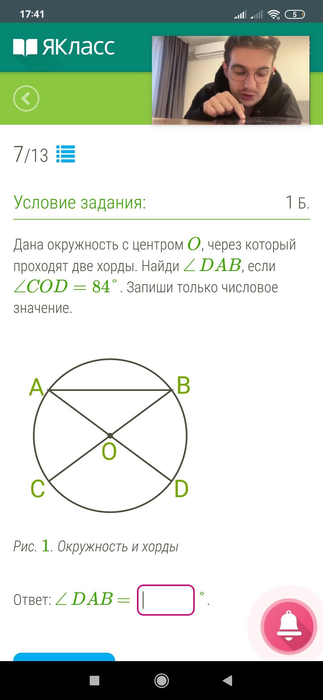 Дана окружность с центром O, через который проходят две хорды. Найди ∠DAB, если ∠COD=84°.
