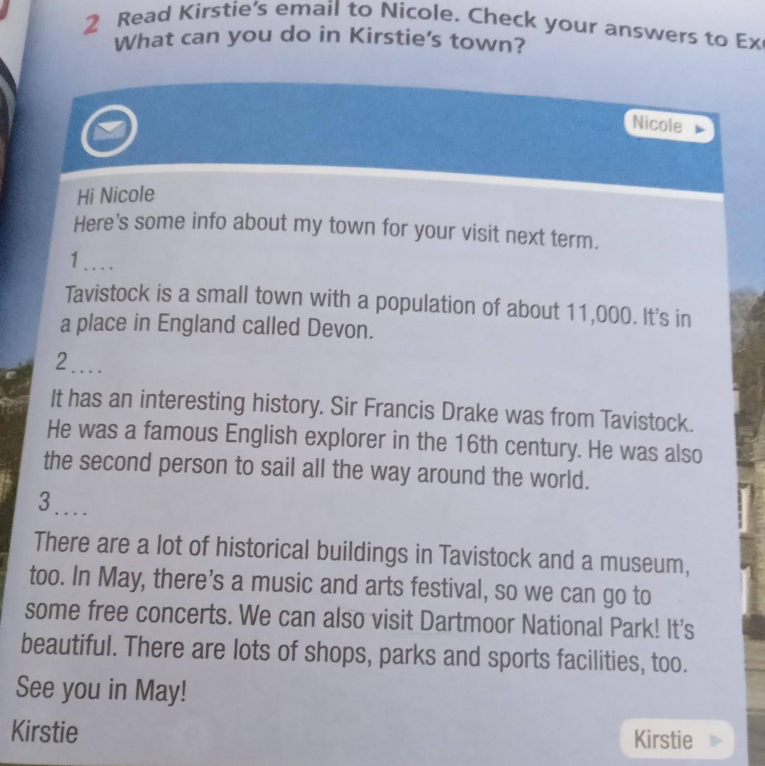 Привет, Николь. Вот немного информации о моем городе для твоего визита в следующем семестре. Тависток — небольшой город с населением около 11 000 человек. Это место в Англии под названием Девон. У него интересная история. Сэр Фрэнсис Дрейк был из Тавистока. Он был известным английским исследователем 16 века. Он также был вторым человеком, совершившим кругосветное плавание. В Тавистоке много исторических зданий и музей. В мае проходит фестиваль музыки и искусств, так что мы можем пойти на несколько бесплатных концертов. Мы также можем посетить национальный парк Дартмур! Это прекрасно. Есть много магазинов, парков и спортивных сооружений. До встречи в мае! Кирсти Кирсти