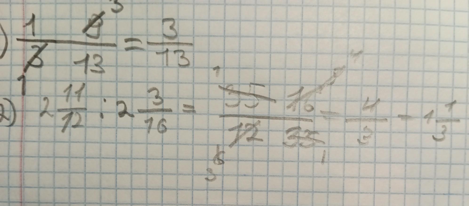 1) 1/3•9/13=1/1•3/13=3/13 2) 2 11/12:2 3/16=35/12:35/16=35/12•16/35=1/6•8/1=1 2/6=1 1/3
