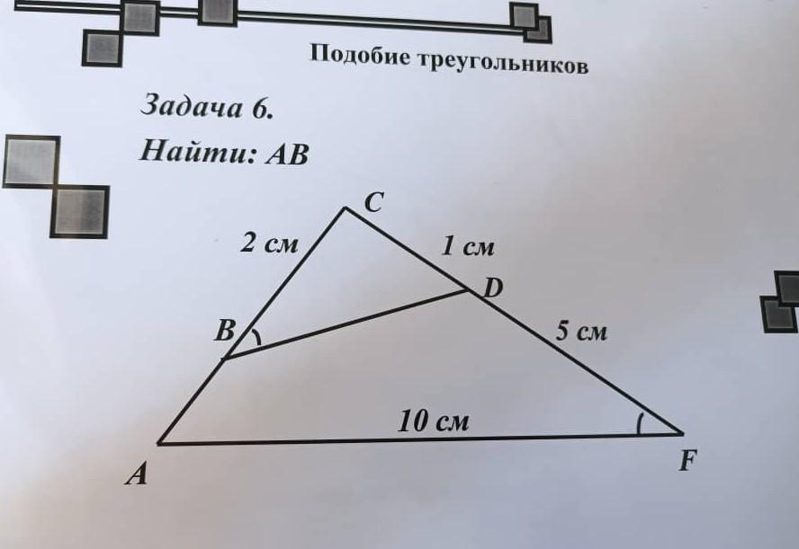 Объяснение:угол CBD=CFA; уголС общий. Тогда треугольник ВСD подобен треугольнику АСF(по двум углам) ;пусть АВ=х, тогда АС=2+х. А СF=6, рассмотрим отношения этих отрезков. CF/CB=AC/CD=> 6/2=2+x/1. Откуда х=1. Ответ:AB=1