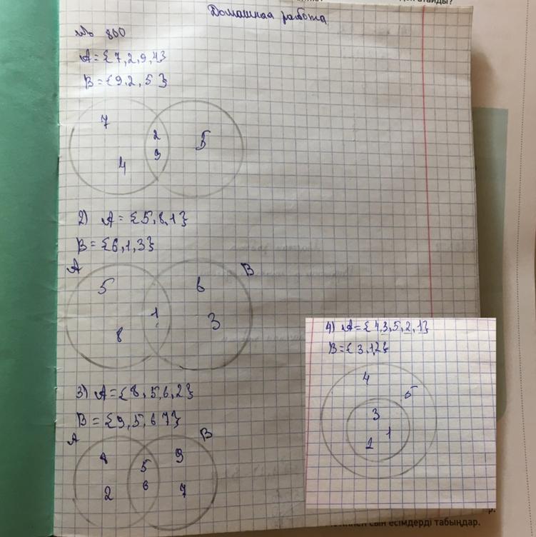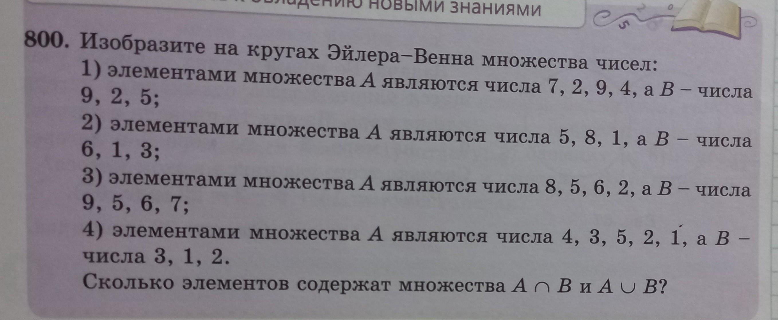 числа 800. Изобразите на кругах Эйлера-Венна множества чисел: 1) элементами множества А являются числа 7, 2, 9, 4, а В – числа 9, 2, 5; 2) элементами множества А являются числа 5, 8, 1, а В – числа 6, 1, 3; 3) элементами множества А являются числа 8, 5, 6, 2, а В – числа 9, 5, 6, 7; 4) элементами множества А являются числа 4, 3, 5, 2, 1, а в числа 3, 1, 2. Сколько элементов содержат множества A *дуга* B и A *перевёрнутая дуга* B?