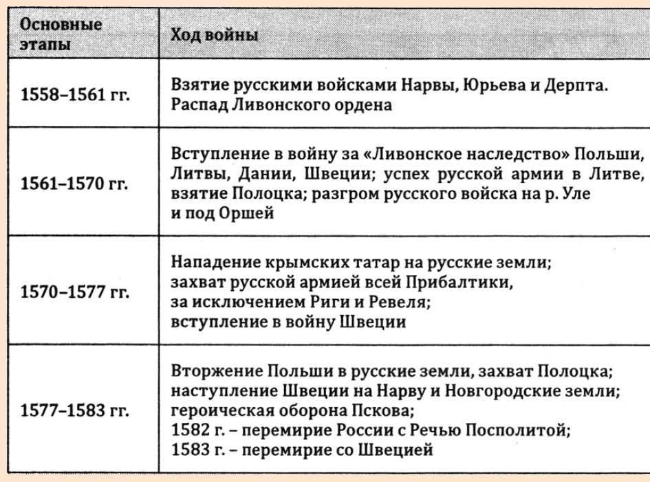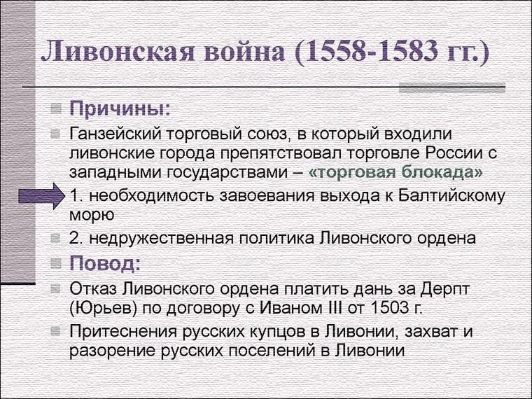 1:Ливонская война была очень длительной. Она продолжалась с 1558 по 1583 год. Происходила в правление Ивана Грозного. Ее целью было утверждение России в землях, прилегающих к Балтийскому морю. Войну подразделяют на 3 этапа. На 1 – Россия воевала против Ливонского Ордена, который распался в 1561 году. На 2 этапе – против России выступила коалиция европейских государств – Дания, Речь Посполитая и Швеция. На последнем этапе военные действия идут между Россией и Швецией и Польшей.