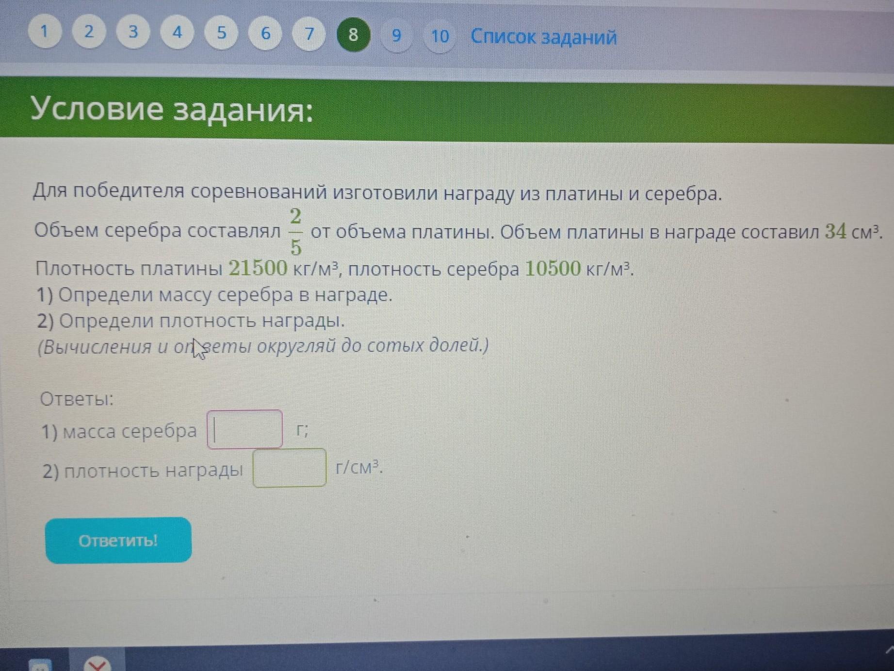 ρ=m1+m2/V1+V2=7,31+10,965/0,001+3,4e-5≈17674кг/м³