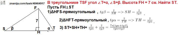 В треугольнике TSF угол ∠T=α, ∠S=β. Высота FH = 7 см. Найти ST.