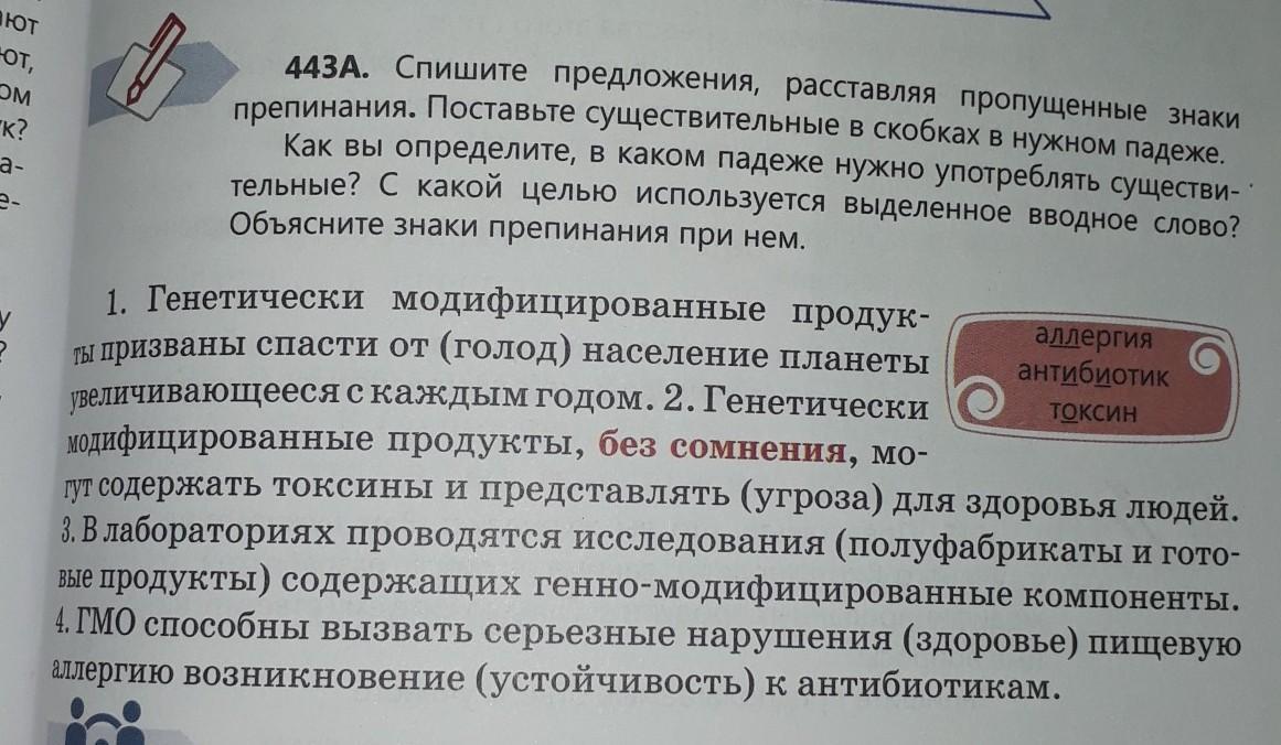 44ЗА. Спишите предложения, расставляя пропущенные знаки препинания. Поставьте существительные в скобках в нужном падеже. Как вы определите, в каком падеже нужно употреблять сушести- тельные? С какой целью используется выделенное вводное слово? Объясните знаки препинания при нем. 1. Генетически модифицированные продук- аллергия а призваны спасти от (голод) население планеты антибиотик Пеличивающееся с каждым годом. 2. Генетически О модифицированные продукты, без сомнения, мо- содержать токсины и представлять (угроза) для здоровья людей. В лабораториях проводятся исследования (полуфабрикаты и голо- е продукты) содержащих генно-модифицированные компоненты, КПО способны вызвать серьезные нарушения (здоровье) пищевую аргию возникновение (устойчивость к антибиотикам.