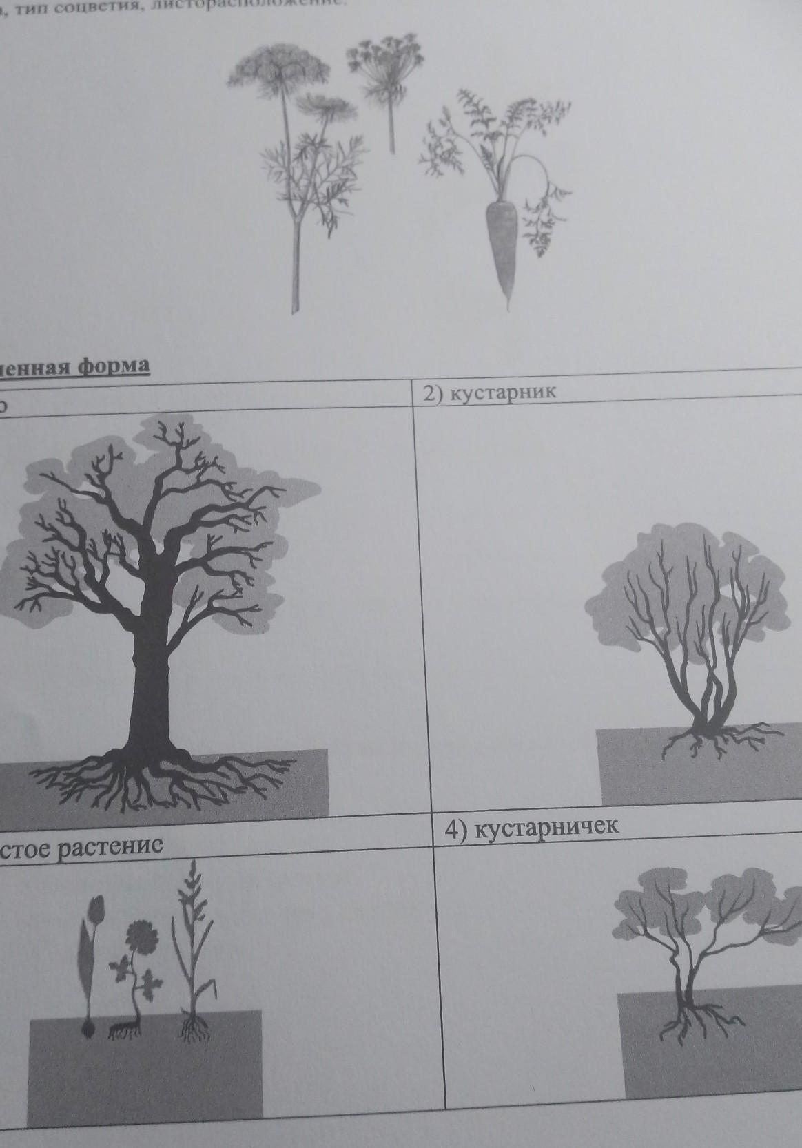 Рассмотрите изображение моркови посевной и опишите её по следующему плану: жизненная форма, тип соцветия, листорасположение. да пR HISTY А. Жизненная форма 1) дерево 2) кустарник ка 4) кустарничек 3) травянистое растение