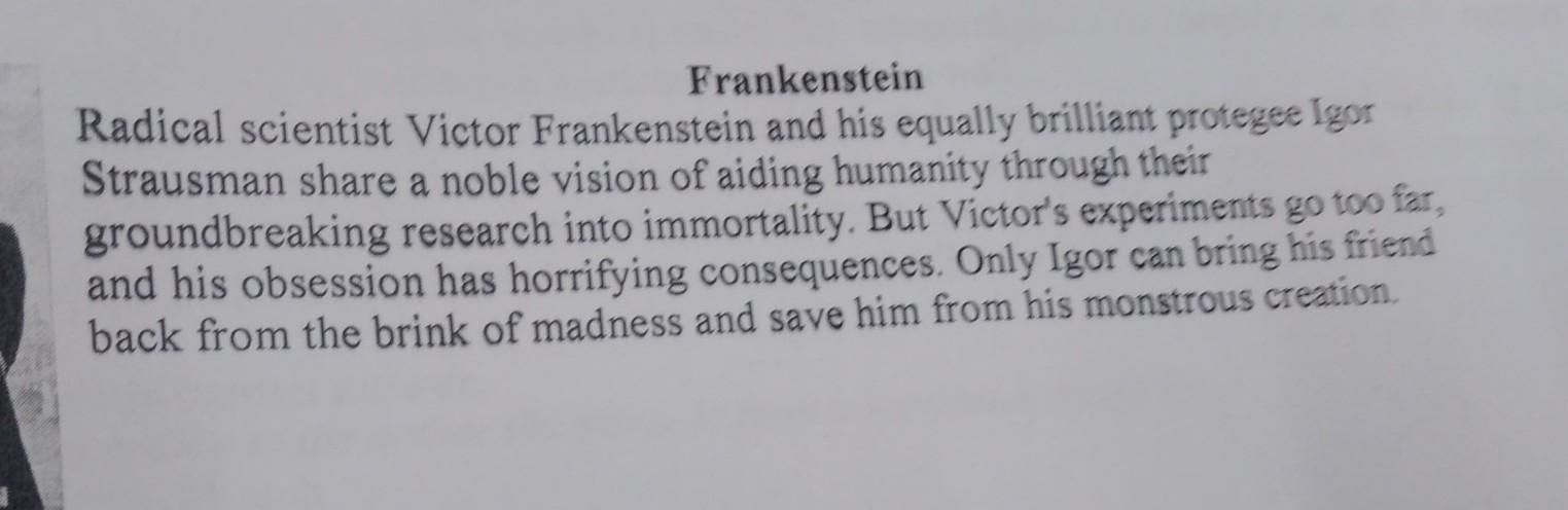 scientist Victor Frankenstein and Igor Straussman share a noble vision of helping humanity through their research into immortality. But Victor's experiments go too far, with dire consequences. Only his friend Igor can stop him. На вот, думаю верно