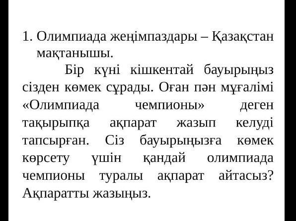 1 балл Жазылым 10 балл Берілген екі тапсырманың бірін таңдап, жазба жұмысын орындаңыз. Сөздерді орфографиялық нормаға сай жазып, қосымшаларды дұрыс жалғаныз, сөйлем соңында қойылатын тыныс белгілерді орынды қолданыңыз. 1. Олимпиада жеңімпаздары - Қазақстан мақтанышы. Бір күні кішкентай бауырыңыз сізден көмек сұрады. Оған пән мұғалімі «Олимпиада чемпионы» деген тақырыпқа ақпарат жазып келуді тапсырған. Сіз бауырыңызға көмек көрсету үшін қандай олимпиада чемпионы туралы ақпарат айтасыз? Ақпаратты жазыңыз.помогите срочно