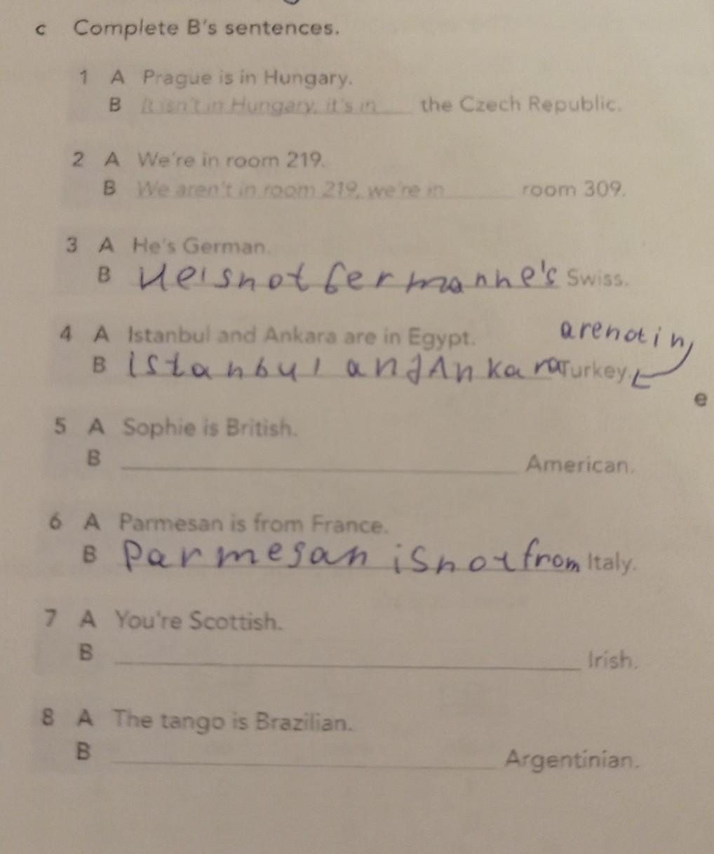 cComplete B's sentences. 1 A Prague is in Hungary Biustin Hungary, its in the Czech Republic, 1 2 A We're in room 219. B We aren't in room 219. we're in room 309 3 A He's German B Helshot bermanne's swiss. 4 A Istanbul and Ankara are in Egypt. arenati B Istanbul angan ka naturkey L 5 A Sophie is British B American 6 A Parmesan is from France. B parmesan is not from Italy 7 A You're Scottish. B Irish 8 A The tango is Brazilian. B Argentinian