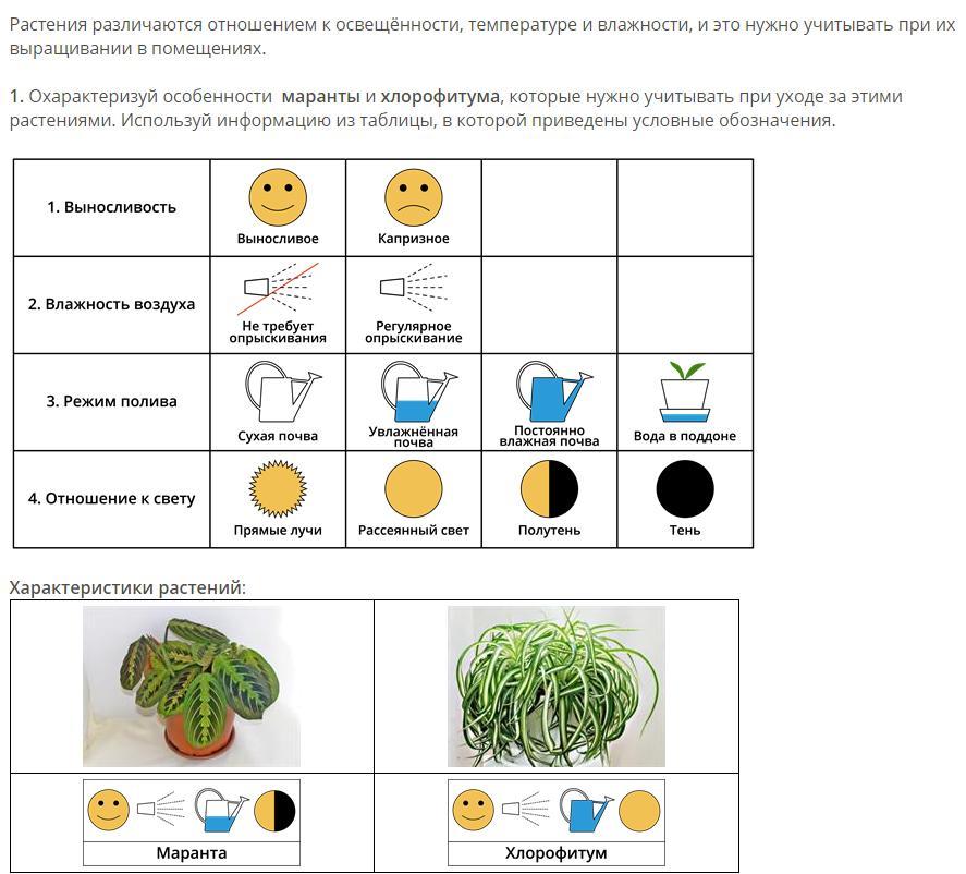 1. Охарактеризуй особенности маранты и хлорофитума, которые нужно учитывать при уходе за этими растениями. Используй информацию из таблицы, в которой приведены условные обозначения.