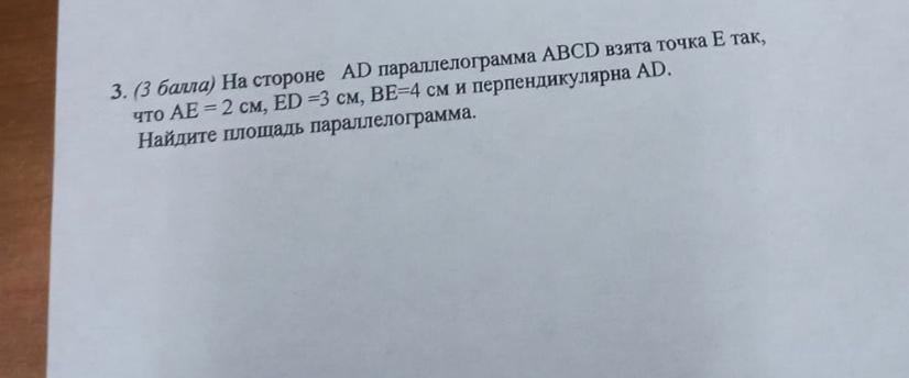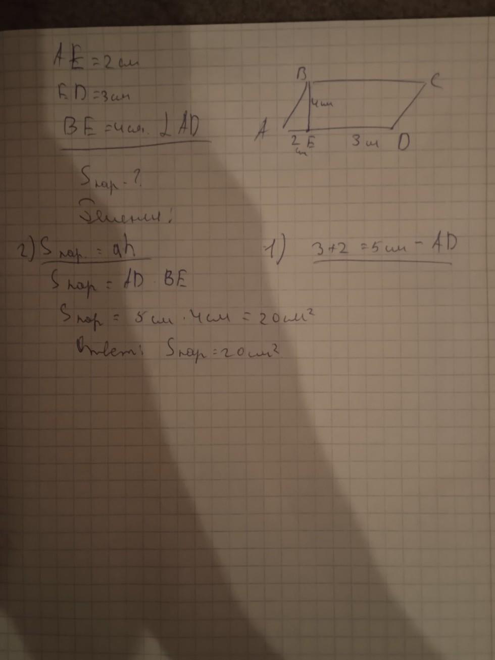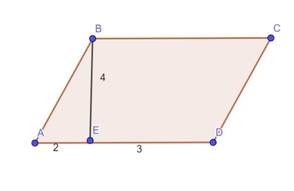 На стороне АD параллелограмма ABCD взята точка E так,что AE =2 см ЕD=3 cм, ВЕ=4см и перпендикулярна АD. Найти S параллелограмма.