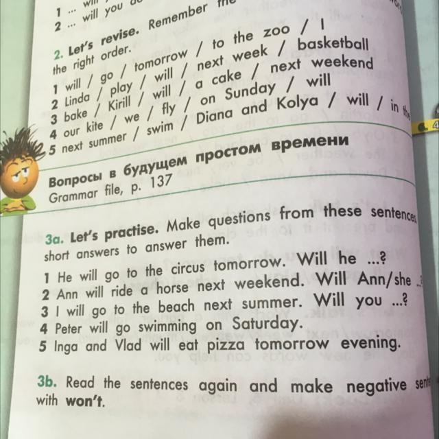 3Lyuba and Vadim will at the circus yesterday.They will at the clothes’ shop today.They will to a cafe’ tomorrow