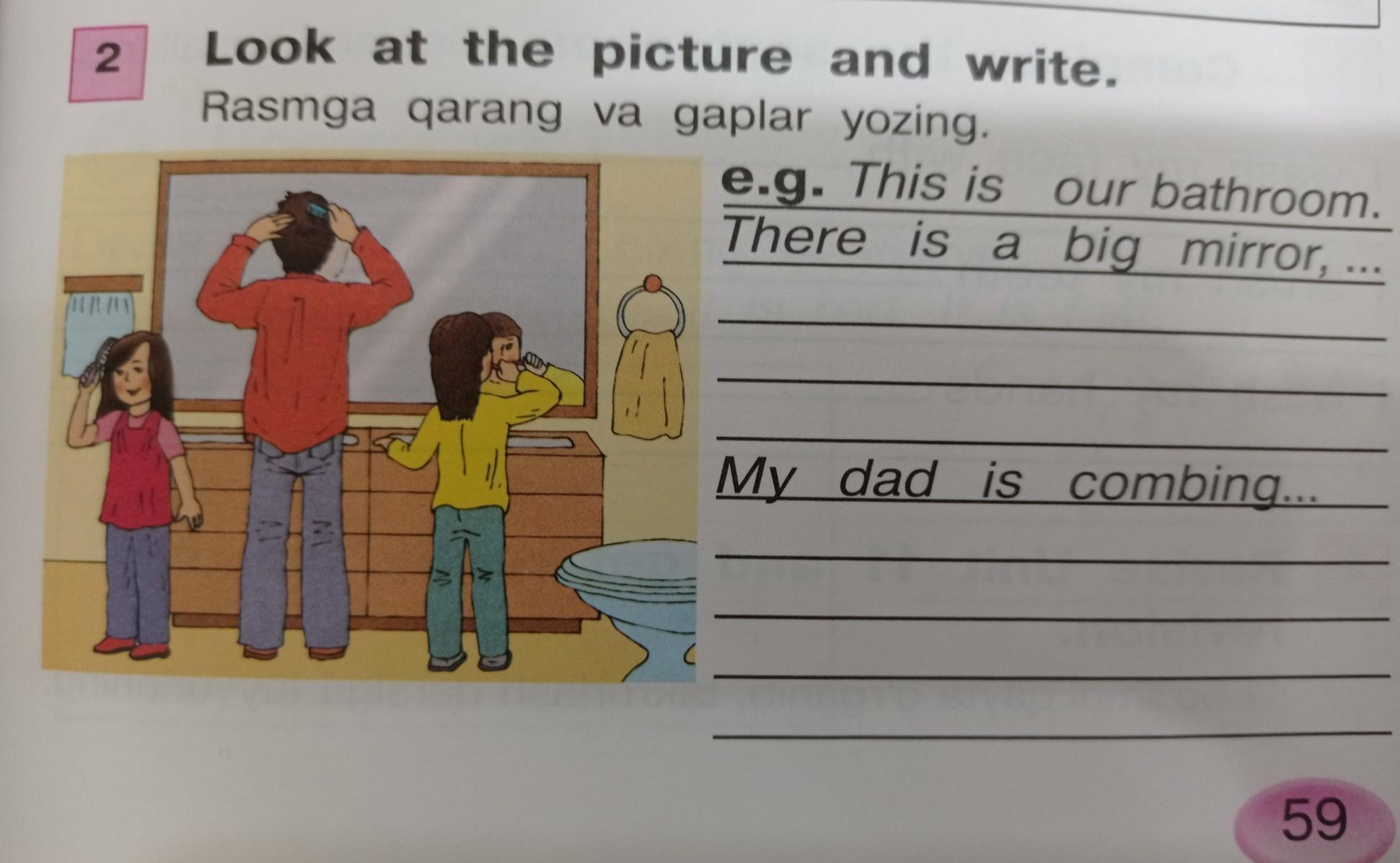 2 Look at the picture and write. Rasmga qarang va gaplar yozing. e.g. This is our bathroom. There is a big mirror, My dad is combing...