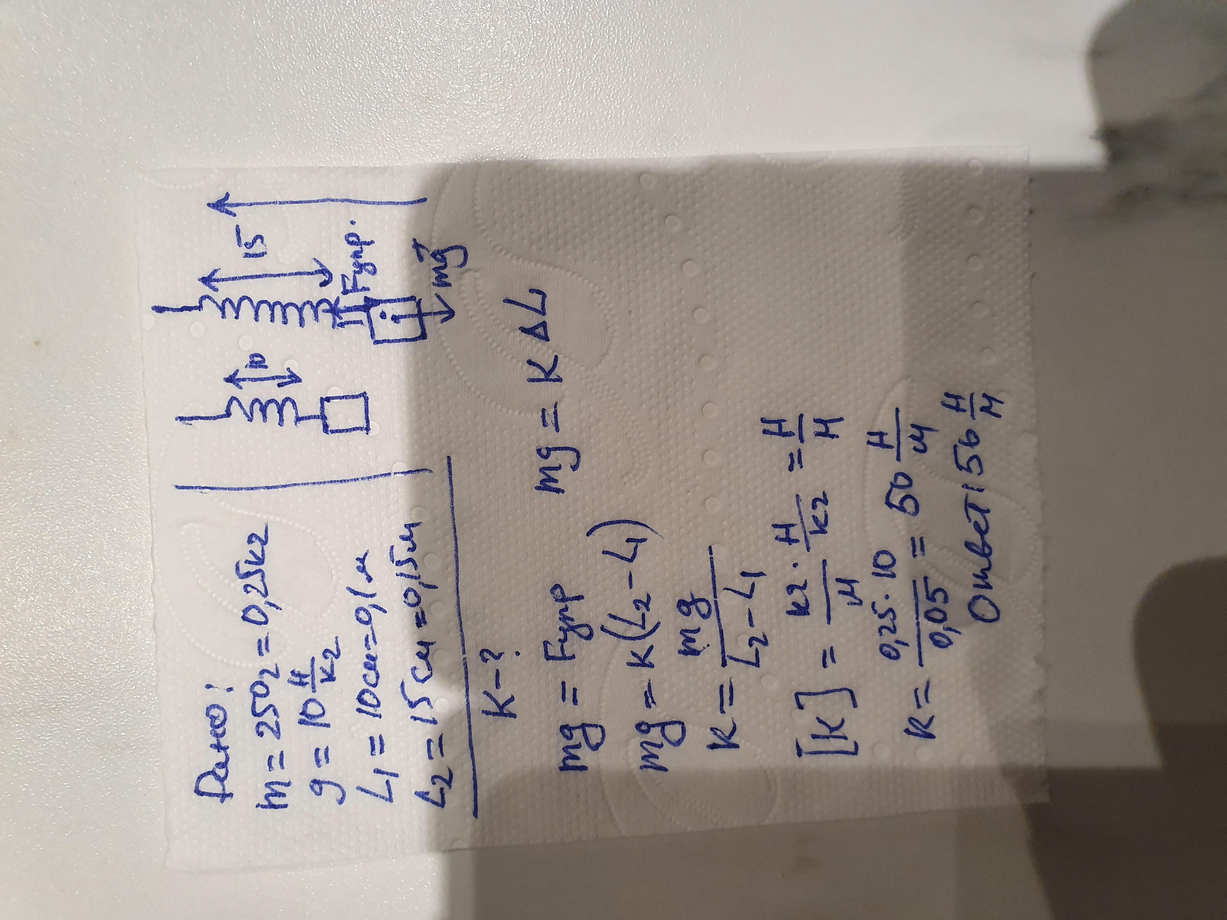 Вертикально подвешенная пружина под действием груза массой 250 г растянулась с 10 см до 15 см.