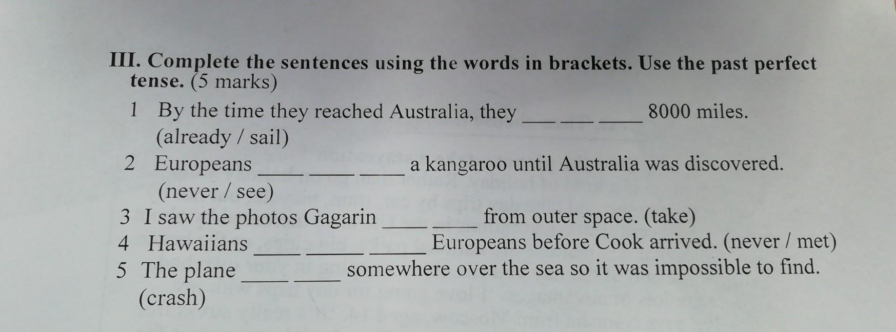 III. Complete the sentences using the words in brackets. Use the past perfe tense. (5 marks) 1 By the time they reached Australia, they 8000 miles. (already / sail) 2 Europeans a kangaroo until Australia was discovered. (never / see) 3 I saw the photos Gagarin from outer space. (take) 4 Hawaiians Europeans before Cook arrived. (never 5 The plane somewhere over the sea so it was impossible to (crash)