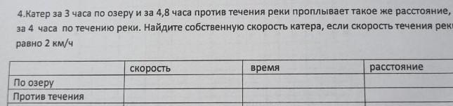 4.Катер за 3 часа по озеру и за 4,8 часа против течения реки проплывает такое же расстояние, что за 4 часа по течению реки. Найдите собственную скорость катера, если скорость течения реки равно 2 км/ч По озеру скорость время расстояние Против течения По течению
