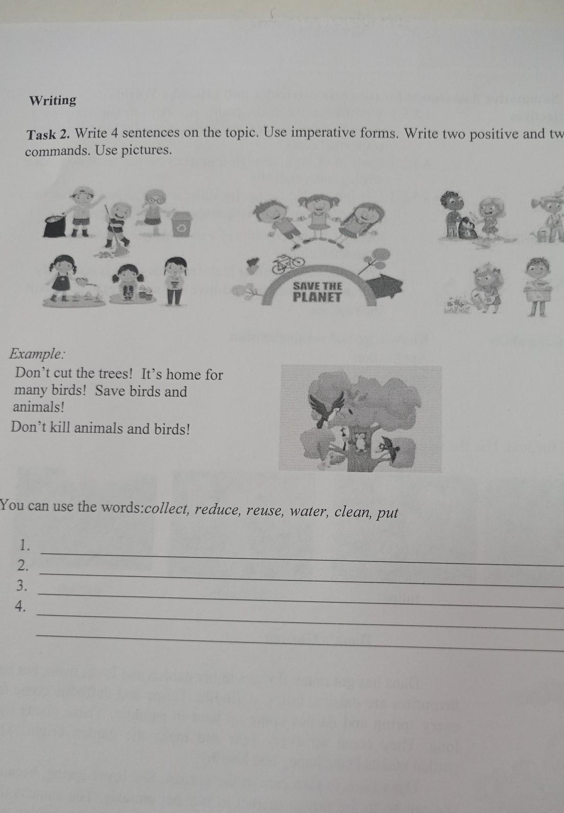 Writing Task 2. Write 4 sentences on the topic. Use imperative forms. Write two positive and two negative commands. Use pictures. SAVE THE PLANET