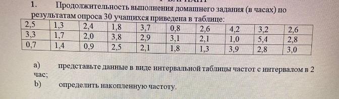 1. Продолжительность выполнения домашнего задания (в часах) по результатам опроса 30 учащихся в таблице;